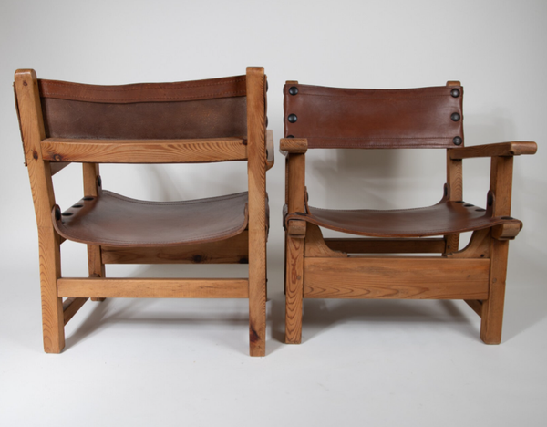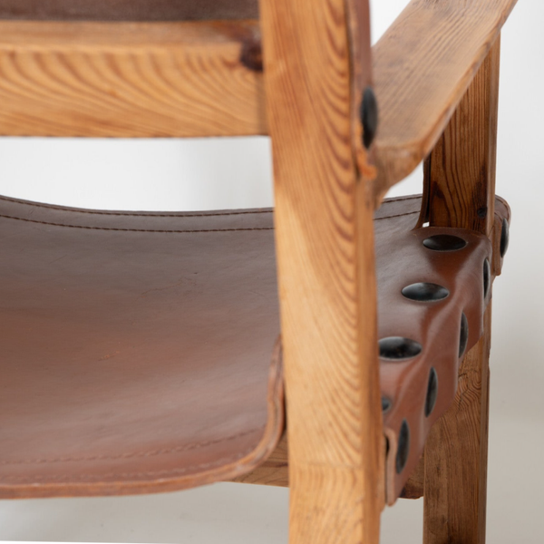 60's Brutalist Armchair in Pine Wood and Saddle Leather (2 available)