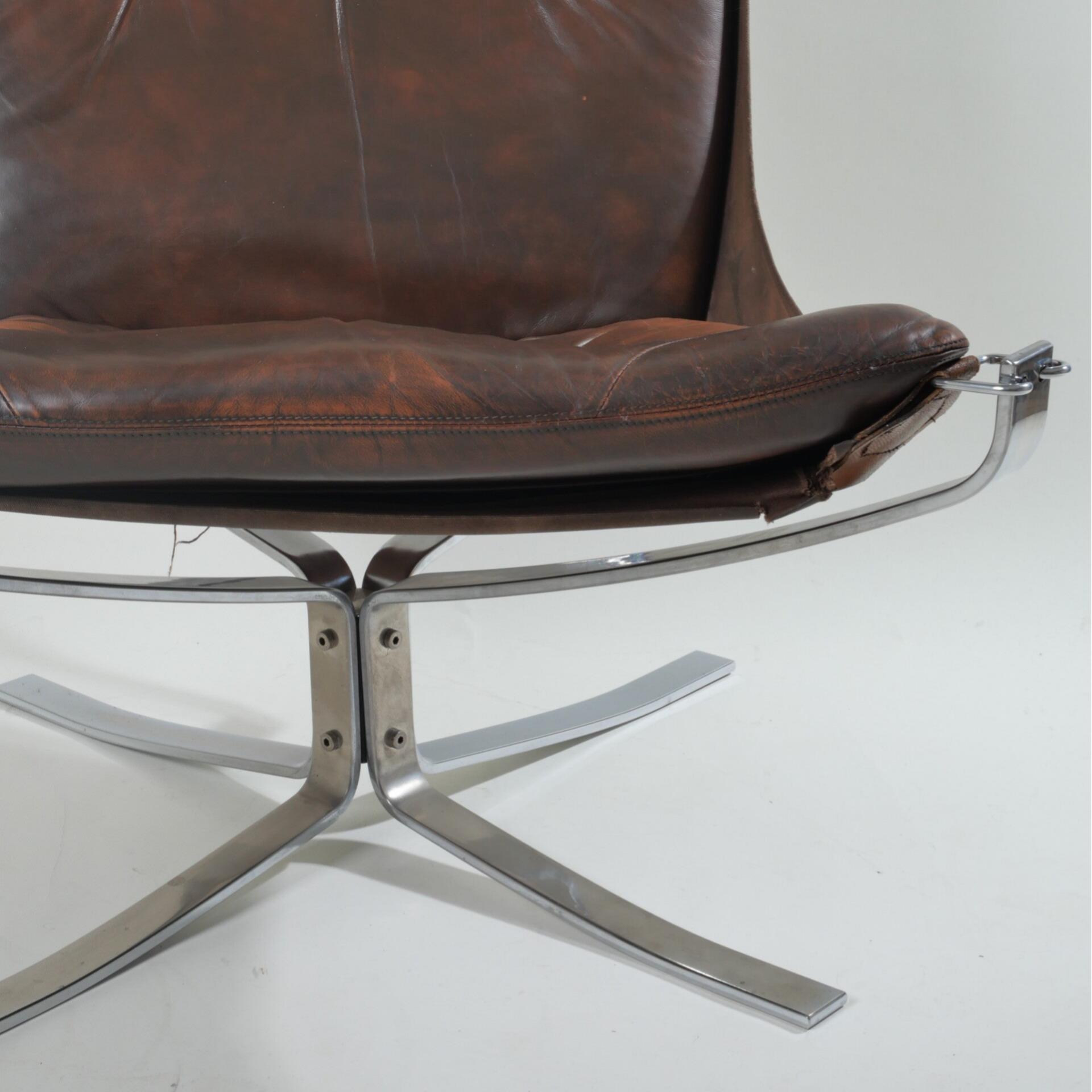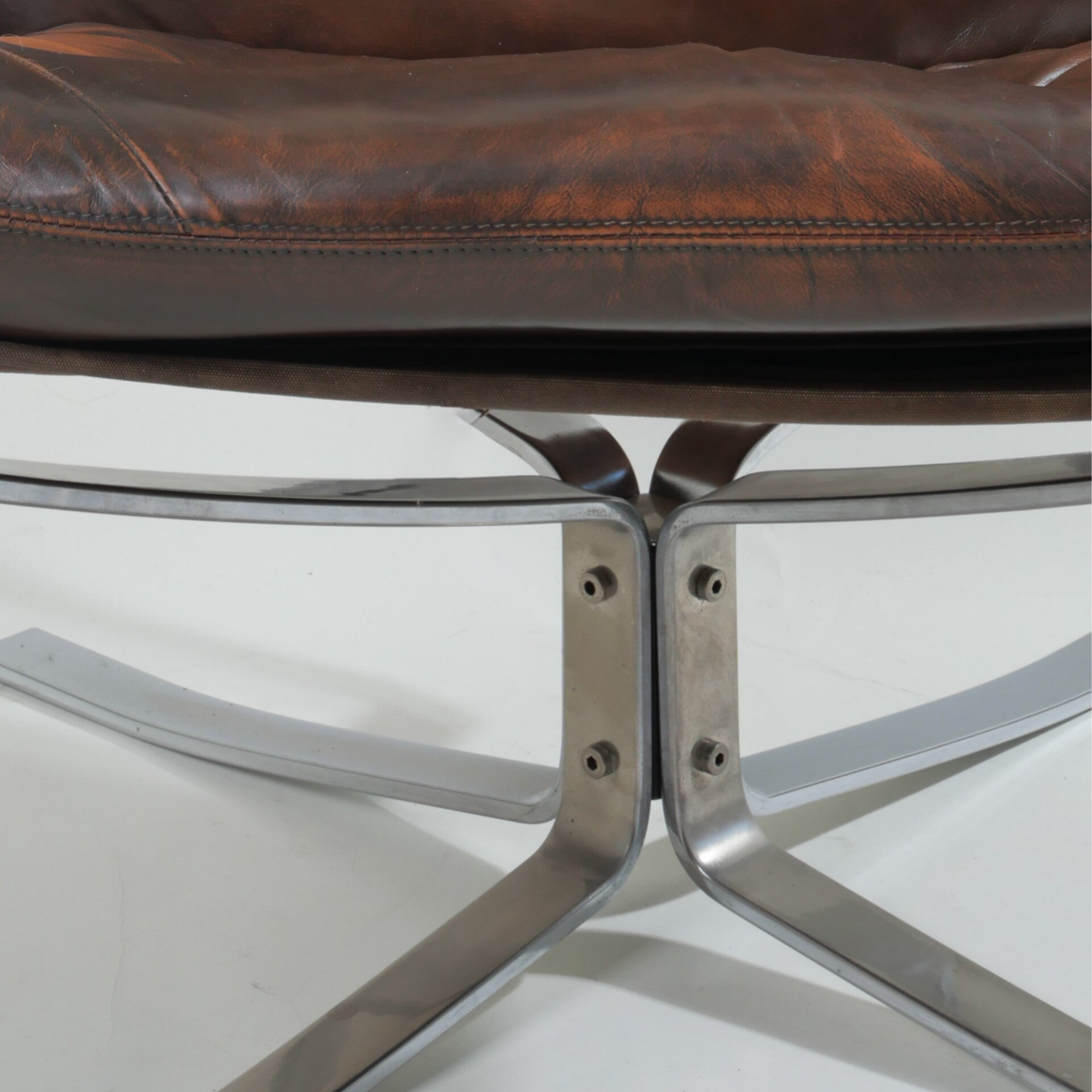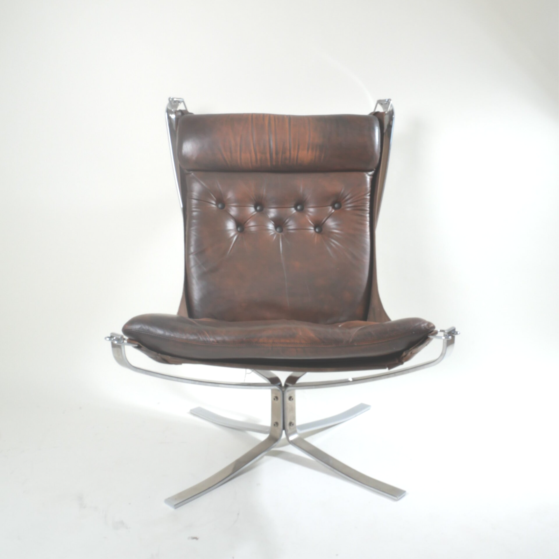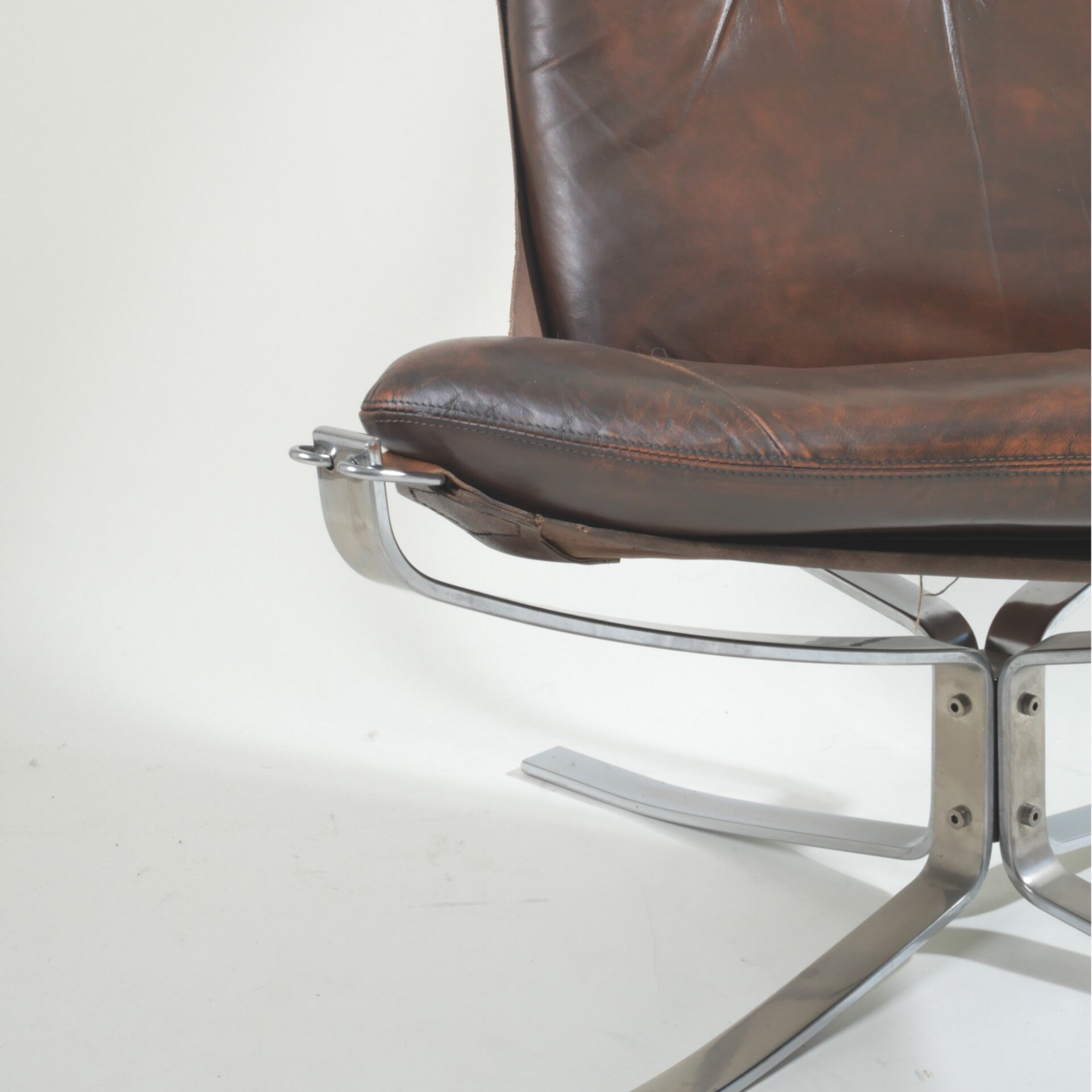 Rare chrome high back brown leather Falcon chair with amazing patina designed by Sigurd Resell and made by Vatne Mobler of Norway in the 1970s.