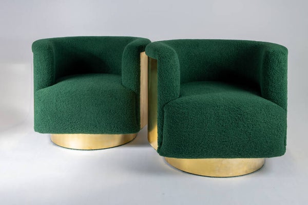 Beautiful Italian swivel chairs in brass and green boucle fabric in a hollywood regency style reminiscing the glorydays of the 1920's.