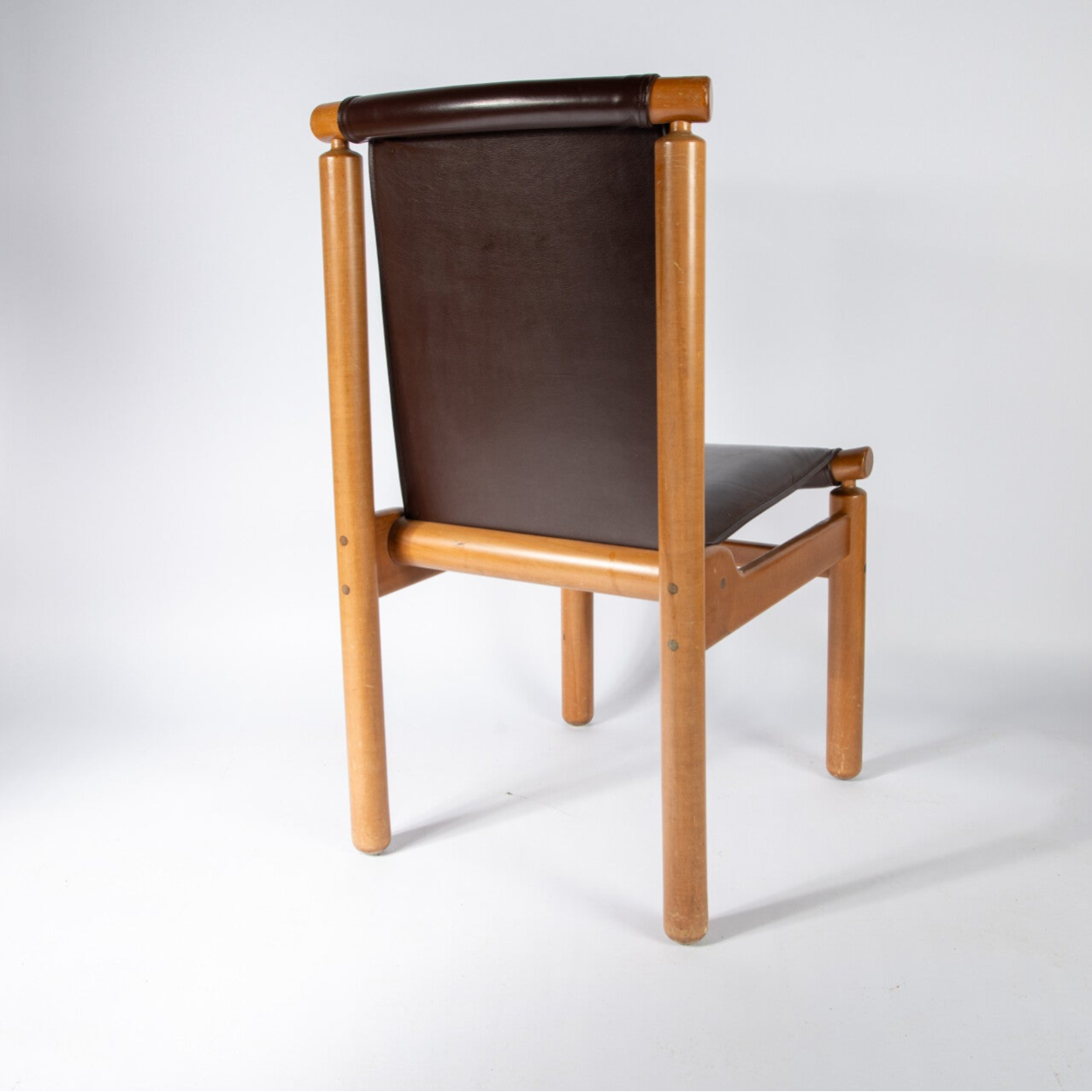 Unlike the original documented upholstery, which feature a hanging leather sling seat, these chairs have a solid seat with an internal base, offering a slightly firmer and more supportive sitting experience.