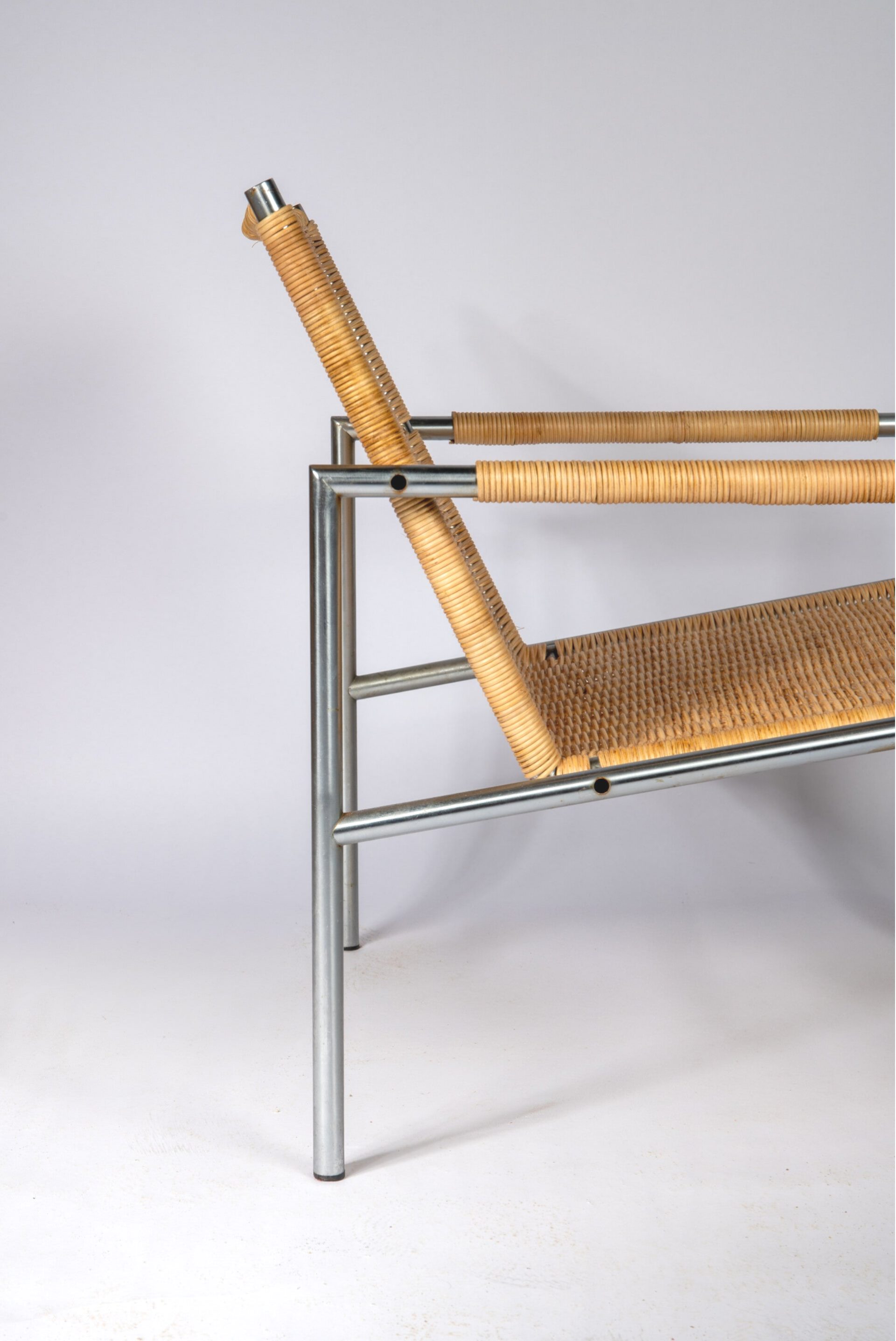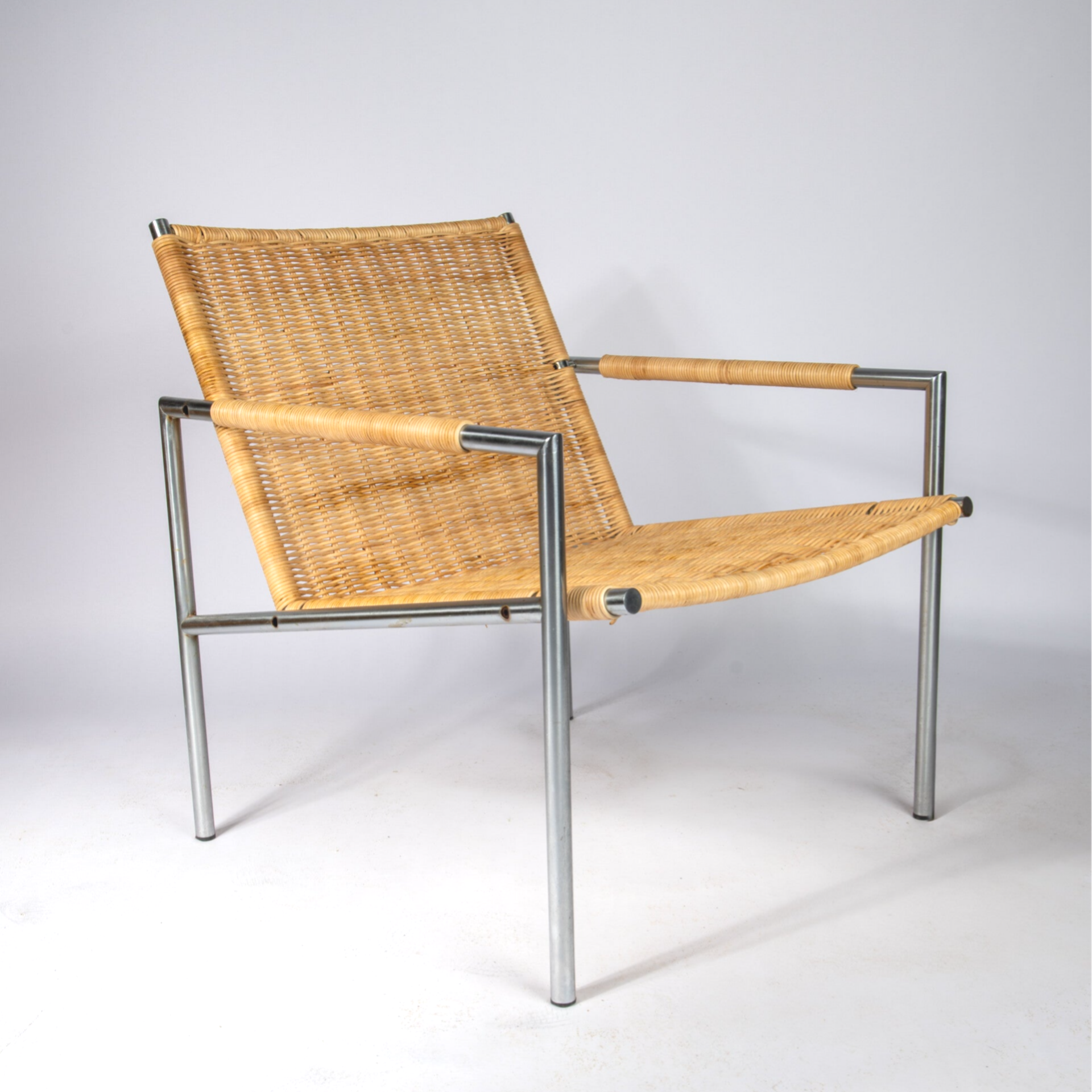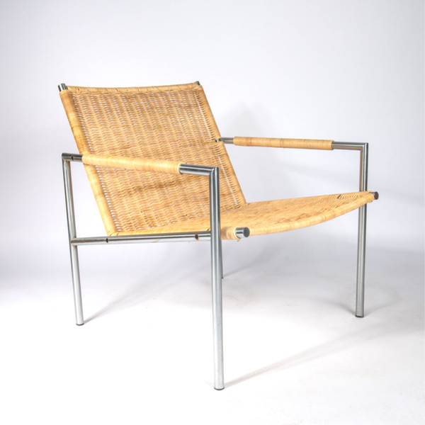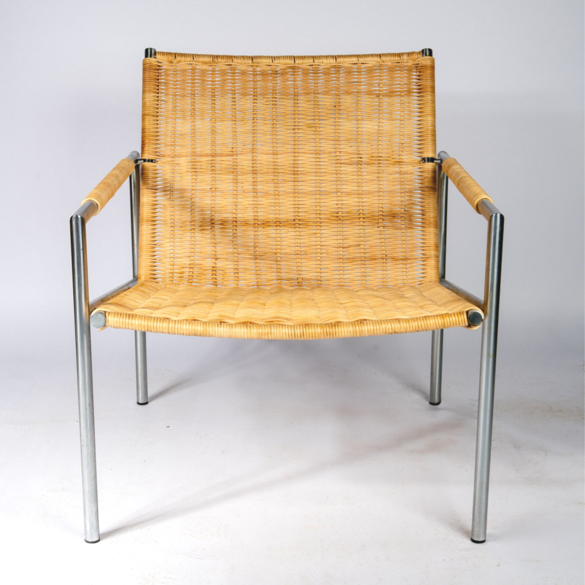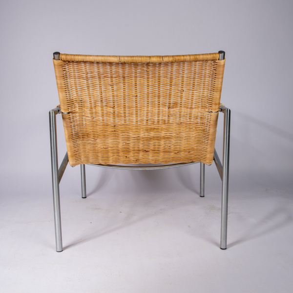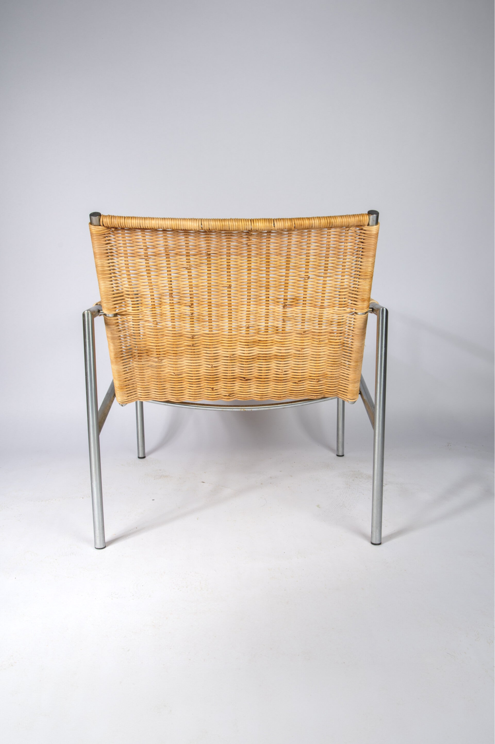 The frame is made of tubular brush steel and these chairs were made perfectly. Really one of the most beautiful Dutch chairs and these are hard to find in old edition. The chair was bought by a the former owner in the 70's and we did not touch the frame in order to preserve its heritage. The cane has been replaced by an craftsman and treated with quality products in order to ensure a long life.