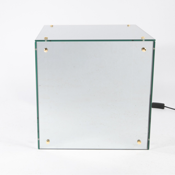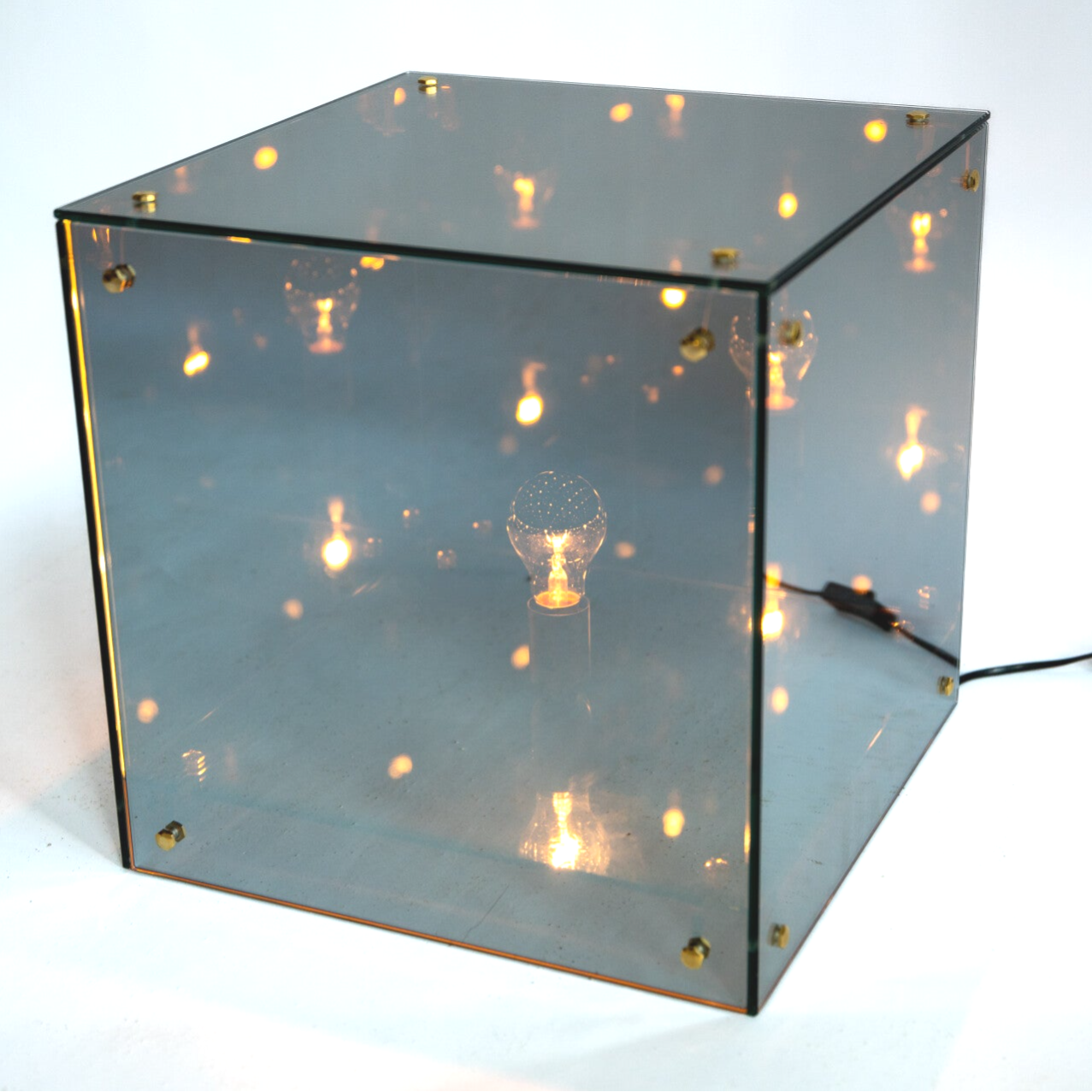 Prismar table lamp produced in Italy in the 1990s. The lamp features five mirropane crystal mirrored sides, chrome hardware and one individual bulb create an optical "infinity" effect.