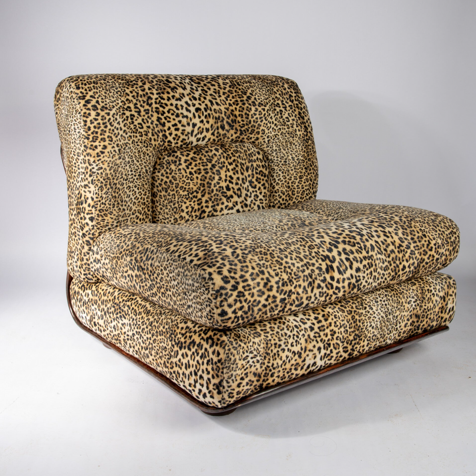 Set of amazing lounge chairs with a panter print fabric and a wooden frame produced in Italy in the 1980s.